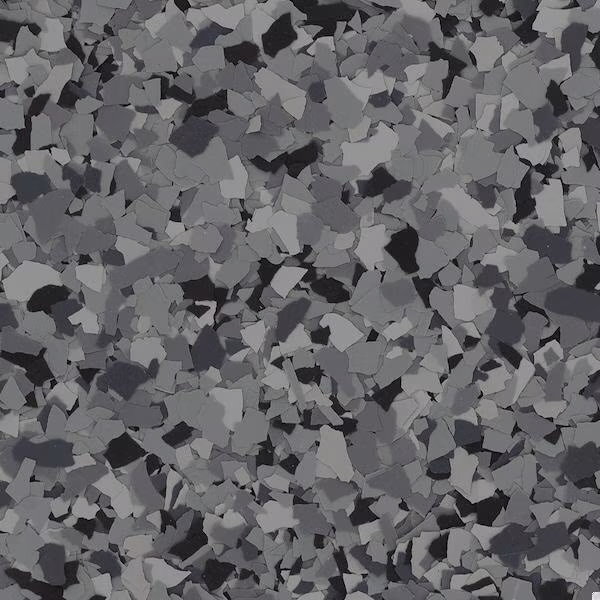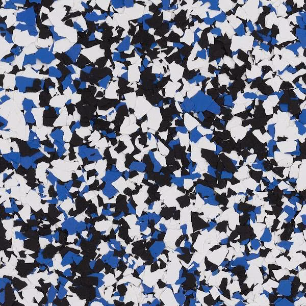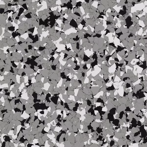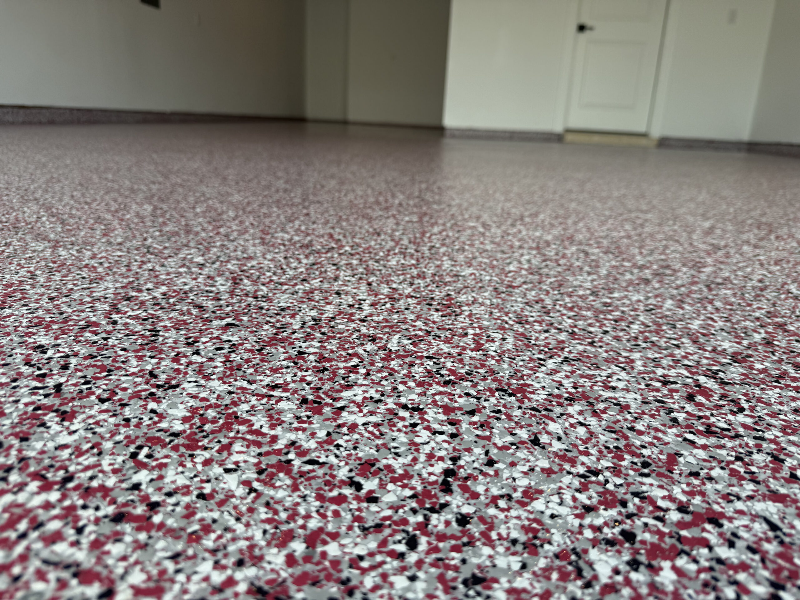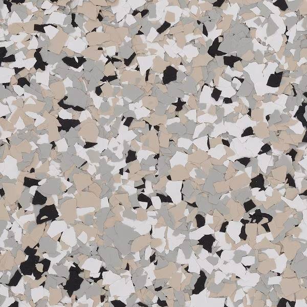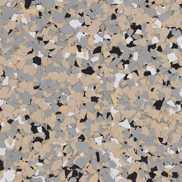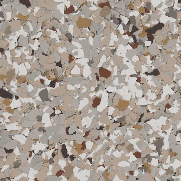Decorative vinyl flakes are broadcast into the epoxy to add texture, slip resistance, and enhanced durability.